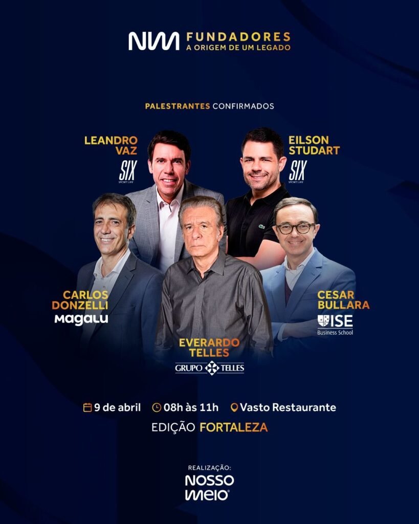 No dia 9 de abril, das 8h às 11h, o Vasto Restaurante, em Fortaleza, recebe o evento NM Fundadores: A origem de um legado, promovido pelo Nosso Meio. O encontro reúne lideranças à frente de empresas com diferentes perfis — do varejo nacional a negócios familiares e ao setor de bem-estar — para compartilhar como são conduzidas decisões estratégicas no dia a dia da gestão.